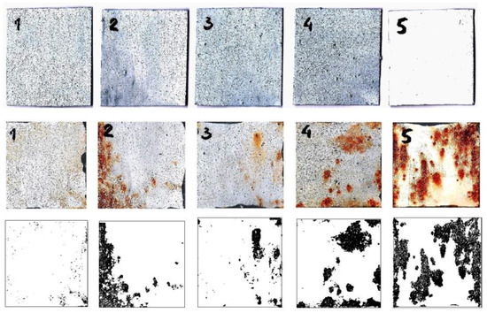 The images of the samples before (top), and after immersion in corrosive media (3% NaCl) for 150 h (middle). (bottom) The images show the visual presentation of the corroded area of the samples as determined by ImageJ software. Composite coatings are marked with 1—sulfamic-acid; 2—citric-acid; 3—succinic-acid, and 4—acetic-acid-doped polyaniline, 5—base coating.