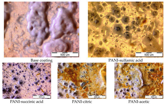 After exposure to the corrosion media for 150 h, the optical images of the samples with the base coating and composite coatings with polyaniline doped with sulfamic acid were taken and are shown in Figure 5. As can be seen, the base coating was covered with huge blisters, while the composite coating showed only traces of corrosion products. The other composite coatings showed some corrosion products, Figure 5, but we only observed some small areas of delamination and a few blisters on the composite with PANI doped with acetic acid.