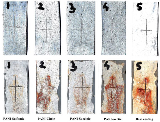 The main problem with classical organic coatings is the mechanical damage that occurs with rapid corrosion. To investigate the influence of the damage to the coatings, Figure 6 shows the images of the samples before and after 100 h of immersion in 3% NaCl. It is obvious that the sulfamic acid-doped PANI composite coating showed only a trace of corrosion that could be attributed to self-healing properties.
