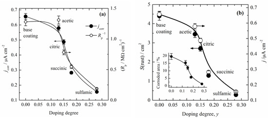 where A508 is the absorbance at 508 nm after immersion; S, cm2, is the surface area of the samples; F = 26.8 A h mol−1 is the Faraday constant; 20 is the conversion factor from 10 cm3 to 200 cm3; and M(Fe) is the atomic mass of iron, 55.85 g mol−1. The calculated corrosion current densities are shown in Figure 8a. It is obvious that corrosion current density closely followed the initial doping degree, and decreased with an increase in the initial doping degree. In order to compare the values of the polarization resistance with the determined jcorr, Figure 8a shows the data of the reciprocal values of the polarization resistance after 96 h, estimated from Figure 4a in [20]. It should be noted that the thickness of composite coatings for Rp was 40 µm, while for in situ determination it was 25 µm. Because jcorr is proportional to Rp−1, an excellent agreement of the trends of these variables was obtained using those two methods. Figure 8b shows the comparison of the corrosion current density with the determined corroded surface area after prolonged immersion in 3% NaCl for 150 h (obtained using ImageJ software and shown in Figure 4). The close connections between the initial doping degree, jcorr, and appearance of the rust on the sample surfaces are obvious. For example, the base coating surface was covered with 20% rust, while the composite coating with PANI–sulfamic acid was only covered with approximately 1%. Therefore, all of the investigations suggest that the initial PANI doping degree in the composite coatings has a great influence on the corrosion protection behavior on mild steel.