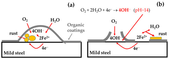 The main degradation mechanisms of the base organic coating were delamination and the formation of blisters, as schematically shown in Figure 9 [3,20]. During the immersion in corrosive media, the development of pores in the coating occurs. Blister formation occurred when oxygen and water penetrate through the coating. Oxygen is reduced to OH− and, with dissolved iron, forms rust that lifts the coatings from the steel surface, as schematically shown in Figure 9a. In the case of delamination (Figure 9b) in two neighboring pores, iron is dissolved in one pore and the released electrons are transferred through the metal to another pore where the oxygen reduction reaction occurs producing OH− anions; rapid alkalization of the pore occurs, reaching a high pH of 12–13 and, in some cases, more than 14 [35,36], which induces loss of the coating adhesion.