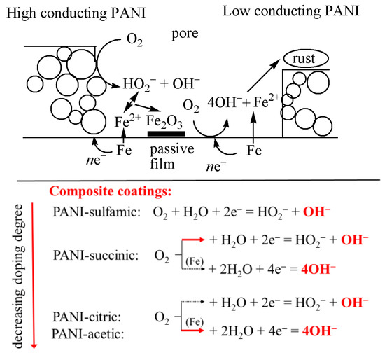 Polyaniline and polypyrrole have been shown to reduce oxygen to hydrogen peroxide and/or hydroxyl anions via two- or four-electron paths [37,38,39]. Hereafter, it can be suggested that polyaniline with a higher doping degree and higher conductivity could reduce oxygen to mainly hydrogen peroxide anions, HO2−, lowering the possibility of pH increase and formation of blisters or delamination. By decreasing the doping degree, the conductivity of PANI also decreases, and parallel two and four oxygen reduction paths could occur, but with a much lower concentration of OH− and a smaller tendency of coating degradation, as schematically presented in Figure 10. It should be also mentioned that the formed hydrogen peroxide anions could react with Fe2+ to form a passive film of Fe2O3 via the reaction: