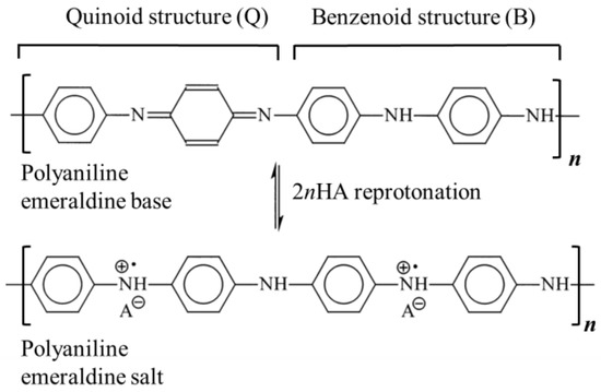 - Stejskal, J.; Prokeš, J.; Trchová, M. Reprotonation of polyaniline: A route to various conducting polymer materials. React. Funct. Polym. 2008, 68, 1355. [Google Scholar] [CrossRef]