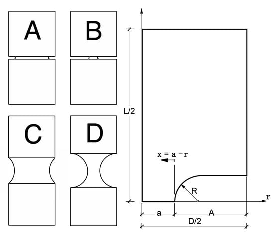 In this paper, four axisymmetric round-notched geometries were used with a circular notch shape and varying depths and radii, as sketched in Table 2 and Figure 1 so as to achieve very distinct stress triaxiality (constraint) levels in the close vicinity of the notch tip. The external diameter was D = 11.25 mm in all specimens after preparation by careful machining to avoid axial curvature and facilitate the alignment of the specimens. Testing under axial displacement was performed using a universal testing machine with fixed grips to guarantee sample alignment and to avoid undesired rotation (i.e., boundary conditions corresponding to imposed axial displacement at the sample ends).