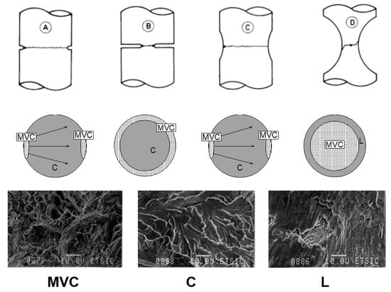 In the tests performed in air [], scanning electron microscope (SEM) fractographic analysis showed that the fracture process always initiates in a fibrous or dimpled region by a mechanism of micro-void coalescence (MVC) and later propagates in an unstable manner by a cleavage-like (C) micro-mechanism in geometries A, B and C, or in stable manner by MVC followed by shear lip (L) in the case of geometry D.