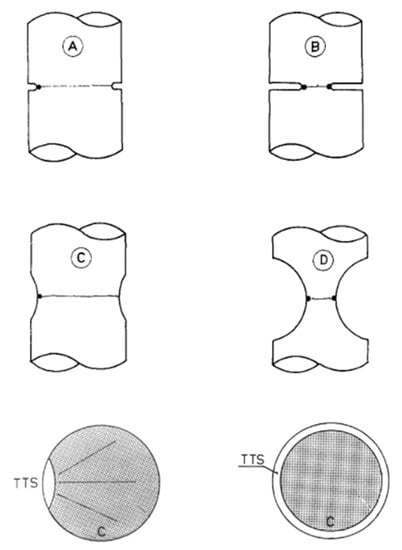 A plausible explanation of the type of MFM in each case of Figure 4 would be the following: in sharply-notched geometries A and B, the intense stress concentration produced by the sharp notch creates a maximum of hydrostatic stress near the notch tip, thereby “pumping” hydrogen to locations in the near-tip zone and thus creating the worst area (the most damaged region) as a local TTS zone placed just at the specimen surface in the form of either a surface crack (sample A) or a surface external ring (sample B).