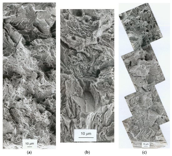 In the case of the first set of geometries exhibiting the most brittle fracture mode (geometries A, B, and C containing the main area of cleavage/brittle fracture in the cross-sectional area, cf. Figure 2), the cleavage micro-fracture mode is oriented cleavage in the case of samples A and C (single fracture initiation point) and randomly-oriented cleavage sample B (multiple or extended fracture initiation locations).