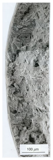 To complete the information about the TTS features, Figure 9 shows the initiation of HAMD by TTS in the annular external ring of sample D10, i.e., that of maximum notch depth and maximum notch radius with the minimum test duration of 11 min. Hydrogen damage at the micro-level can be observed in the external circumferential ring, in spite of the short duration of the test.