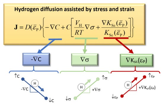 Figure 10 shows a scheme of the influence on hydrogen diffusion of the driving forces according to the aforementioned model of diffusion assisted by stress and strain fields [].