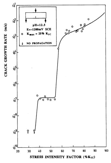 - Proverbio, E.; Longo, P. Sub critical crack growth in hydrogen assisted cracking of cold drawn eutectoid steel. Corros. Sci. 2007, 49, 2421–2435. [Google Scholar] [CrossRef]