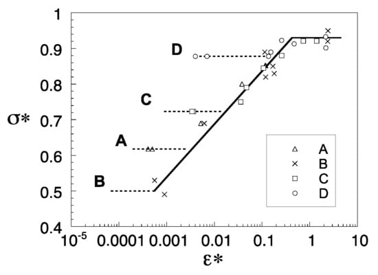 Among the macroscopic variables governing the microscopic phenomenon of HAMD in pearlitic steel, the hydrostatic stress plays a relevant role in hydrogen transport by diffusion [], cf. Equations (1)–(3) and thus the hydrostatic stress distributions in the samples were obtained by a numerical procedure. The finite element method (FEM) with an elastic-plastic code was applied using a Von Mises yield surface with an incompressible constitutive equation.