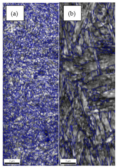 IQ maps showing high angle boundaries more than 15° (blue lines) in the samples heated to 900 °C (a) and 1200 °C (b).