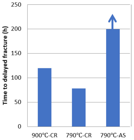 Figure 11 shows the results of the delayed fracture tests by immersing the specimen in a 10% ammonium thiocyanate solution under a maximum stress of 1300 MPa at the bottom of the notch of the specimen.