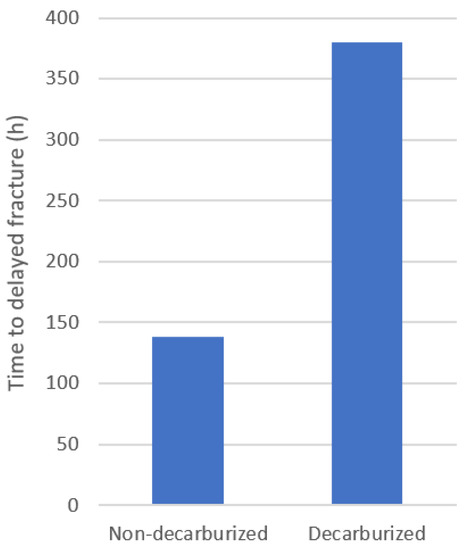 Effect of decarburization on time to delayed fracture of reference and decarburized samples of Steel C heated at 790 °C for 20 min and quenched and subjected to BH treatment.