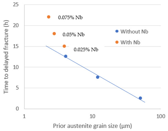 Influence of prior austenite grain size on time to delayed fracture of the steels with and without Nb addition.