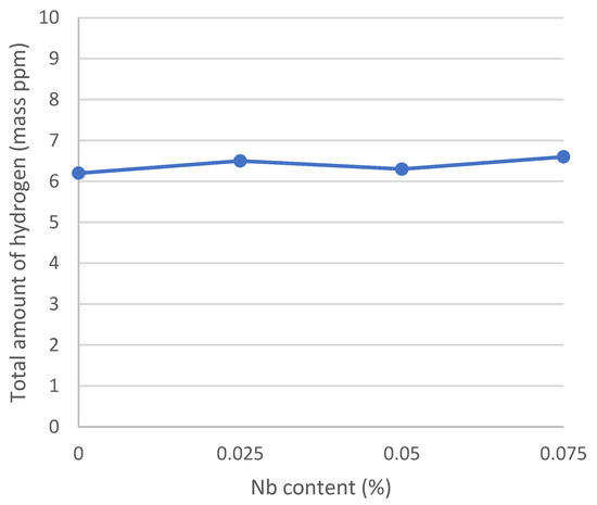 Influence of the Nb content on the total amount of stored hydrogen in samples immersed in a 10% ammonium thiocyanate solution for 48 h after BH treatment.
