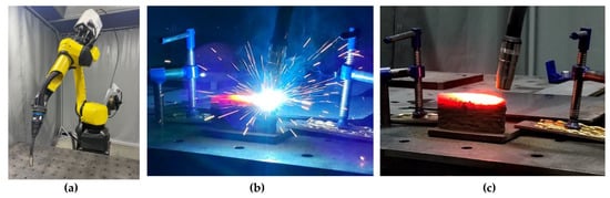 Images of printing equipment FANUC AM-100iD with a welding torch (a), deposition process (b), and cooling of the layer after deposition (c).