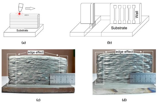 Printing scheme of the wall and the layout for the samples cut out (a,b); walls obtained using GMAW (c) and coldArc (d) technologies.