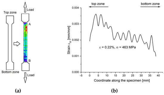 Scheme of data extraction from strain fields of the sample: (a) Strain field obtained by DIC with the central line for data extraction; (b) graph of the εyy stain component extracted from the central line of the strain field.
