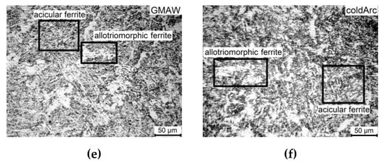 Microstructure of the cross section of the middle part of the walls at the distance of 10–15 mm (a,b) and 15–30 mm (c–f) from the substrate for GMAW (a,c,e) and coldArc (b,d,f) modes.