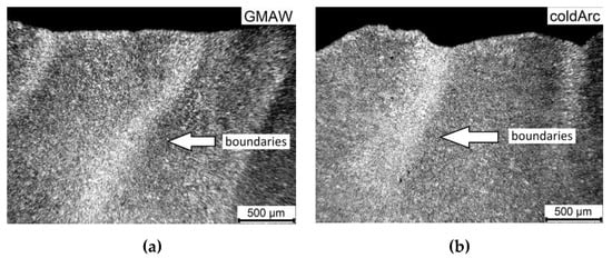 Microstructure of the boundaries of the wall layers in the cross section for GMAW mode (a), and coldArc mode (b).