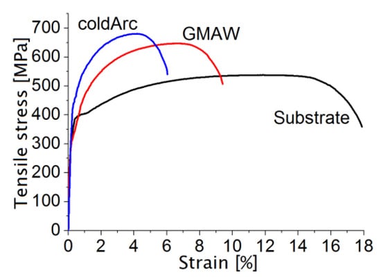 Specimens cut out from the 3D-printed wall do not have a pronounced yield point. For them, at the level of 300 MPa (GMAW) and 450 MPa (coldArc), there is a slight deviation in the loading diagram, but the formation of yield plateaus.