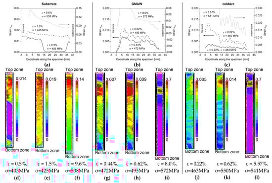 Stress–strain diagrams of tested specimens (a) and longitudinal strain component εyy along the line in the center of the specimen cut out from the substrate (b), GMAW (c), and coldArc (d) walls. Evolution of strain fields obtained via digital image correlation during tensile tests of specimens cut out from the substrate (d–f), GMAW (g–i), and coldArc (j–l) walls. The width of all specimens was 4 mm.