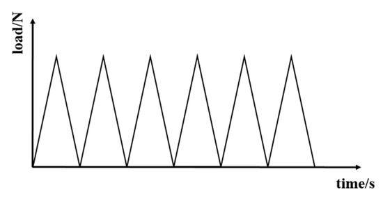 The fatigue cracks growth rate experiments were conducted on the new titanium alloy under different load ratios by reference to ASTM E647. The test apparatus is an Instron8802 fatigue tester (Instron Corporation, Norwood, MA, USA). The specimens were standard CT, where the specimen width W = 50 mm, the thickness B = 12.5 mm, and the prefabricated initial crack length a0 = 24.5 mm. The specimen size is shown in Figure 1. The test load was a triangular constant amplitude cyclic load with load ratios of 0.03, 0.1, and 0.3. The maximum load was 9000 N, and the loading frequency was 10 Hz. The load spectrum is shown in Figure 2.