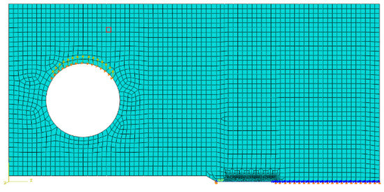The boundary conditions in the simulation are defined as all nodes bond on the two contact surfaces. The point on the rigid line is defined as a reference point, and the rigidly fixed constraint is defined as the reference point. The symmetry constraint in the y-direction is defined on other nodes that are not involved in the crack length calculation. The constraint in the x-direction is defined at any point distal to the crack to prevent the model from moving during the simulation. The load is applied to the upper part of the hole, and the x-direction constraint at the load is defined. The load position and boundary conditions of the model are shown in Figure 3.