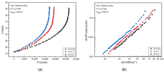 Fatigue crack growth curve of new titanium alloy under different load ratios: (a) a-N curves; (b) da/dN-ΔK curves.