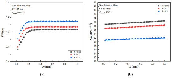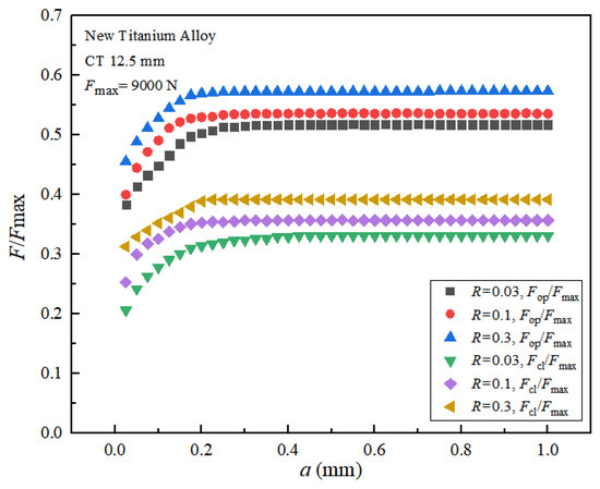 The crack closure effect of the new titanium alloy at load ratios of 0.03, 0.1, and 0.3 was investigated numerically. The variation curves of fatigue crack closing and opening load with the crack length of the new titanium alloy at the three load ratios are shown in Figure 6. It can be seen that the dimensionless opening load and dimensionless closing load increase with increasing crack length at all three load ratios, and the rate of increase decreases until it is stable. The load ratio significantly affects the crack opening and closing load levels. When the load ratio is 0.03, the dimensionless opening load Fop/Fmax is 0.518, and the dimensionless closing load Fcl/Fmax is 0.33. When R = 0.1, the dimensionless opening load and the dimensionless closing load are 0.536 and 0.356, respectively. When R = 0.3, the dimensionless opening load is 0.575, and the dimensionless closing load is 0.39. As the load ratio increases, both the opening and closing loads increase. The minimum and the average load increase with the enhancement of the load ratio, resulting in a consequent increase in the opening and closing loads.