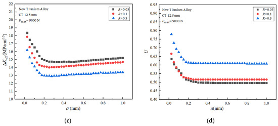 Since the crack opening load determines the magnitude of the driving force of crack growth, to further investigate the crack closure effect on the new titanium alloy, the variation laws of dimensionless opening load Fop/Fmax, ΔK, ΔKeff, and U with the crack growth length a are analyzed in this paper, as shown in Figure 7. It can be seen that the larger the load ratio, the larger the opening load; however, the crack closure parameter U decreases with an increase in the stress intensity factor range ΔK and the effective stress intensity factor range ΔKeff. With the increase in load ratio, the crack closure effect on the new titanium alloy decreases. The main reason is that the increase in the load ratio causes the minimum load to become larger, and the increased stress will be offset with part of the residual compressive stress, making the residual compressive stress for crack closure smaller. The crack closure effect will be weakened accordingly.