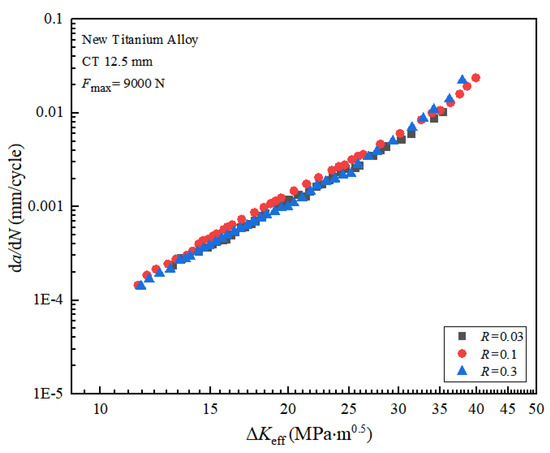 As shown in Figure 5b, the fatigue crack growth rate of the new titanium alloy tends to increase with an increase in the load ratios. Scholars [31,32,33] considered that the load ratio effect of metallic was caused by the crack closure induced by the plastic region at the crack tip. Therefore, based on the numerical simulation results of crack closure of the new titanium alloy under different load ratios, the effective stress intensity factor amplitude was used to describe the fatigue crack growth rate of the new titanium alloy, as shown in Figure 8. It shows that the fatigue crack growth rates of the new titanium alloys at the three load ratios present the same trend. This is mainly because the crack closure effect decreases with an increase in the load ratio; the crack closure parameter U increases, and the range of stress intensity factor controlling crack growth decreases, making the variation of da/dN under different R with the range of effective stress intensity factor ΔKeff converge. It also shows that crack growth is mainly controlled by the range of effective stress intensity factors. The main reason for the load ratio effect is the crack closure induced by the plastic region at the crack tip.