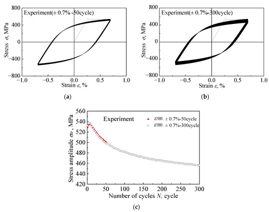 Figure 3 shows the experimental results of axle steel EA4T under symmetric strain cycling at a strain loading rate of 2 × 10−3/s with a strain amplitude of ±0.7%, where Figure 3a,b show the cyclic stress-strain curves at different cycles of axle steel EA4T, and Figure 3c shows the relationship curve between the responsive stress amplitude and the number of cycles under different cycles. The number of cycles is set to 50 and 300, respectively.