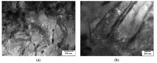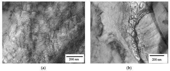 - when the uniaxial tensile deformation is 5%, the main dislocation configuration can be observed by the Transmission Electron Microscope (TEM) as dislocation tangles, as shown in Figure 7a. Meanwhile, dislocation pileup can be observed at the grain boundaries, as shown in Figure 7b. When the deformation of uniaxial tension reaches 8%, the main dislocation configuration is high-density dislocation tangle, as shown in Figure 8a, where a small portion of grains have a tendency to form dislocation walls, as shown in Figure 8b.