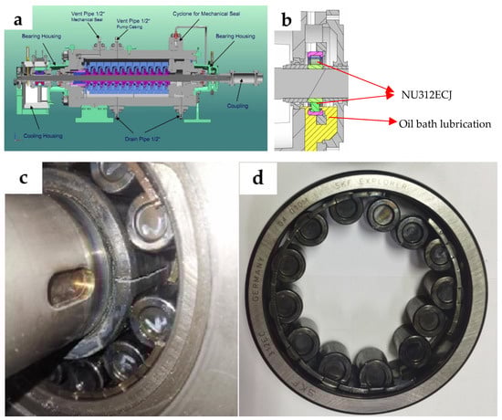 Pump structure and condition of the drive-end bearing damage. (a) Cross-sectional structure of the charging pump. (b) Cross-sectional structure of the drive-end bearing housing. (c) Disassembling the pump reveals a bearing failure. (d) Faulty bearing and the cage with multiple breaks.