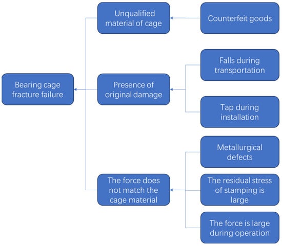 A metallographic failure analysis route was designed to address the failure mode of the bearing cage fracture. Firstly, a macroscopic inspection was conducted to identify the fracture location of the cage. Secondly, microscopic observation and analysis of the fracture surface were performed to determine the fracture characteristics of the cage and analyze its stress patterns. By combining the results of microcosmic and macrocosmic analogical observations, the presence of initial damage was confirmed, which helped to investigate whether the bearing has incurred damage during transportation and installation. Subsequently, component analysis and metallographic examination were conducted on the bearing cage to ascertain the presence of metallurgical defects and further determine the material grade of the bearing cage. Lastly, the residual stress of the bearing cage was detected and analyzed to identify the presence of machining defects within the bearing. Based on the stress experienced during operation, a comprehensive evaluation is conducted to assess the impact of the cage fracture fault.