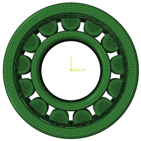 The inner ring, outer ring, and roller of the bearing were meshed with 1.5 mm hexahedral elements (C3D8R). The cage was separately densified with 0.5 mm C3D10M elements, with a total number of 404,116 units, as shown in Figure 4.