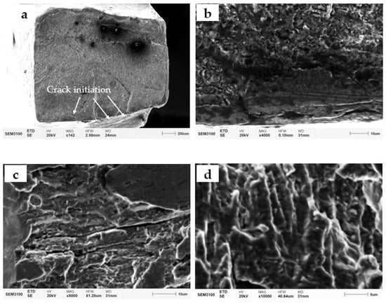 After the cage fracture was cleaned, surface morphology observation was performed using a scanning electron microscope (CIQTEK SEM3100, CIQTEK Ltd., Hefei, China). The main crack initiation of the cage fracture was located on the inner side of the pocket, which was a line initiation, as shown in Figure 6a. No metallurgical defects and machining marks were found in the crack initiation, and the crack extended along the wall thickness to the outer side of the pocket, as presented in Figure 6b. Arc lines and a large number of fine fatigue bands were visible in the expansion area, as shown in Figure 6c,d, and the fatigue expansion area was more than 95%. Thus, the failure of the bearing cage was attributed to fatigue fracture. The secondary crack initiation area was identified outside the pocket hole, indicating that this fracture had multi-initiation crack initiation [23,24].