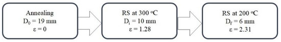 In this work, the Zn–1%Mg and Zn–1%Mg–0.1%Ca alloys were studied. The alloys were melted in an induction furnace in a clay–graphite crucible under air conditions. The melt was poured into a steel mold preheated to 150 °C. The nominal composition of alloys determined using chemical methods was Zn– ~0.98 wt.% Mg and Zn– ~1.06 wt.% Mg– ~0.12 wt.% Ca. The alloys were annealed at 340 °C for 20 h with cooling in water. This condition was referred to as «initial state» or «IS». The rods 19 mm in diameter and 150 mm in length were cut from initial billets to conduct the deformation process. RS was carried out with a gradual decrease in temperature up to 200 °C with a decrease in the diameter of the rods from 19 to 6 mm (Figure 1). RS was carried out on a rotary swaging machine RKM 2129.02 (UZM, Sverdlovsk, USSR). A frequency and a striker travel were 1920 min−1 and 3 mm, respectively. It means that eight strokes of the strikers corresponded to one rotation of the rod around its axis. The rods were heated at a deformation temperature for 45 min before the first pass of RS. Then, the rods were heated for 15 min before every change of the strikers. More details were described in [34]. A study of the alloy after RS was carried out with a total deformation degree equal to 1.28 and 2.31.