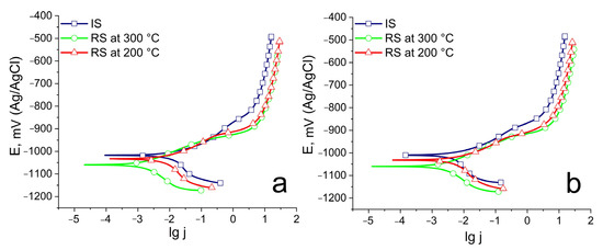 Polarization curves (Ag/AgCl electrode) in 0.9% NaCl solution of the Zn–1%Mg (a) and Zn–1%Mg–0.1%Ca (b) alloys before and after RS.
