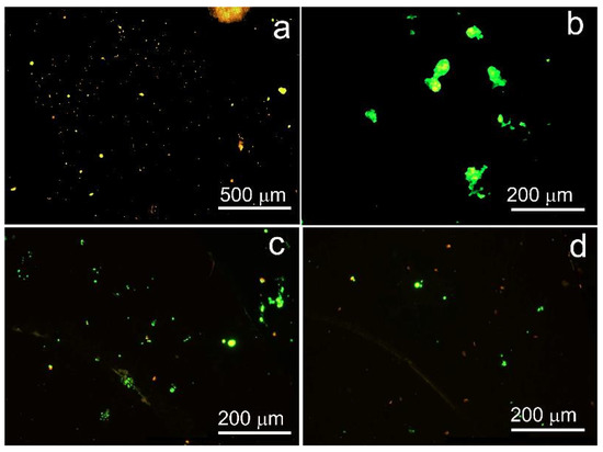 MMSCs on the surface of samples of studied alloys: (a)—Zn–1%Mg in the initial state, (b)—Zn–1%Mg after RS at 200 °C, (c)—Zn–1%Mg–0.1%Ca in the initial state, (d)—Zn–1%Mg–0.1%Ca after RS at 200 °C. Staining via two-color assay to determine live (green) and dead (red) cells.