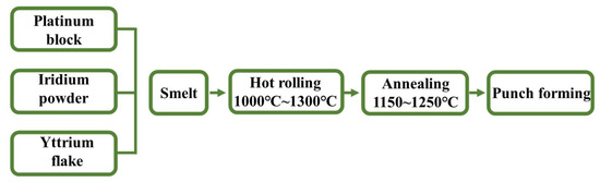 In this work, raw materials included the platinum block (99.95 wt%), iridium powder (99.95 wt%), and yttrium flakes (99.95%). Since the contact material is most commonly prepared via the metal melting method, an ingot with nominal compositions of Pt-10Ir, Pt-10Ir-1Y, Pt-25Ir, and Pt-25Ir-1Y was prepared using an MSM20-7 micro-metal melting furnace with argon at 1 standard atmosphere. Due to the absence of obvious impurities and defects on the surface of the ingots, no surface treatment or cutting was carried out. Then, the billet was hot rolled at 1000~1300 °C, annealed at 1150~1250 °C, rolled to a thickness of 1.0 mm sheet, and then pressed into a small round sheet with a diameter of Φ5.4 mm with a special mold and 63 tons of the single column calibration press (liquid 41–63 type); this was then welded to the Cu rivet with the preparation process shown in Figure 1.