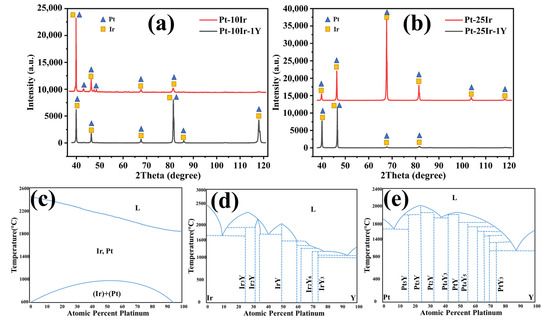 Figure 4 shows the XRD pattern of the Pt–Ir alloy before and after the addition of Y. The characteristic diffraction peaks of the face-centered cubic (fcc) Pt structure and Ir structure were observed, and it could be found that the intensity of Pt and Ir peaks varied. Figure 4a is the diffraction spectra of Pt-10Ir and Pt-10Ir-1Y, and Figure 4b is the diffraction spectra of Pt-25Ir and Pt-25Ir-1Y. Figure 4c–e shows the binary phase diagrams of Pt-Ir, Ir-Y and Pt-Y, respectively. According to the binary phase diagram of Pt and Ir [23,24,25], the two formed a continuous solid solution at a high temperature before decomposing into two fcc solid solution phases with different components at a low temperature. However, the X-ray diffraction pattern shows that there was only one phase. Because the content of the Y element was less, it did not form a second phase with Pt and Ir. In addition, XRD analysis showed that with the addition of the Y element, the peak value of XRD changed greatly. The reason for this was mainly because the atomic radius of the Y element was very different from that of the Pt and Ir elements; therefore, the addition of the Y element could cause the lattice to be distorted, and the corresponding lattice parameters changed, thereby causing the peak value to change.