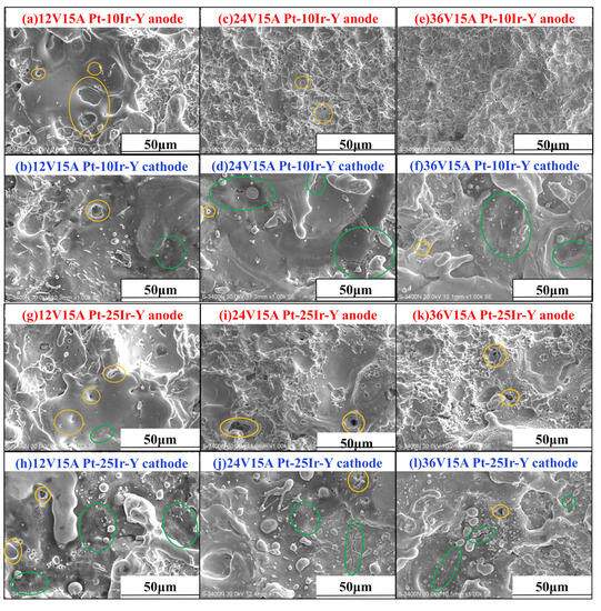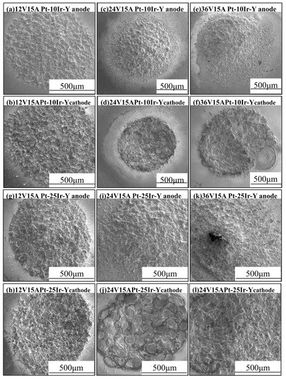 The macroscopic morphology of Pt-10Ir-1Y and Pt-25Ir-1Y eroded composites under the same voltage and different current conditions: (a,g) 12 V, 15 A, anode, (b,h) 12 V, 15 A, cathode, (c,i) 24 V, 15 A, anode, (d,j) 24 V, 15 A, cathode, (e,k) 36 V, 15 A, anode, (f,l) 36 V, 15 A, cathode.