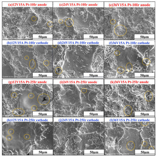 The macroscopic morphology of Pt-10Ir and Pt-25Ir eroded composites under the same voltage and different current conditions: (a,g) 12 V, 15 A, anode, (b,h) 12 V, 15 A, cathode, (c,i) 24 V, 15 A, anode, (d,j) 24 V, 15 A, cathode, (e,k) 36 V, 15 A, anode, (f,l) 36 V, 15 A, cathode.