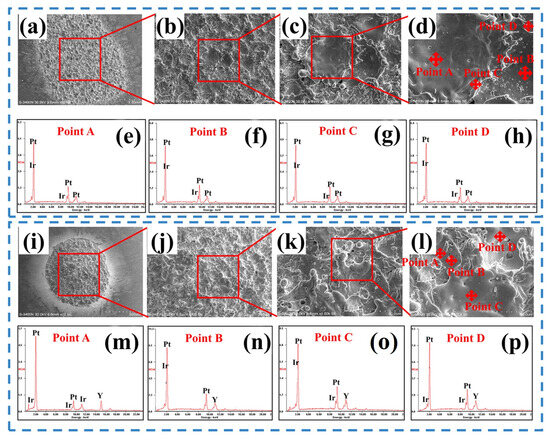 SEM scanning analysis of Pt–25Ir (24 V, 15 A) and Pt-25Ir–Y (24 V, 15 A) moving contact materials. (a–d,i–l) Microscopic positions of the point energy spectrum, (e–h,m–p) Spectra of point energy spectra.