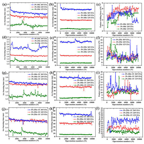 Pt–Ir and Pt–Ir–Y electrical contact materials in 10,000 operations under the same current, different voltage conditions, the average arc energy, and the arc time and welding force per 100 operations. (a) average arc time of Pt–10Ir, (b) average arc energy of Pt–10Ir, (c) average welding force of Pt–10Ir, (d) average arc time of Pt–25Ir, (e) average arc energy of Pt–25Ir, (f) average welding force of Pt–25Ir, (g) average arc time of Pt–10Ir–1Y, (h) average arc energy of Pt–10Ir–1Y, (i) average welding force of Pt–10Ir–1Y, (j) average arc time of Pt–25Ir–1Y, (k) average arc energy of Pt–25Ir–1Y, (l) average welding force of Pt–25Ir–1Y.