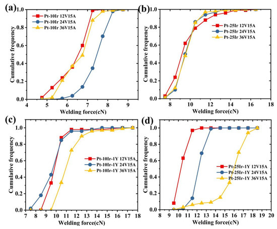The cumulative frequency curve of welding force for Pt–Ir and Pt–Ir–Y under the same current, different voltage conditions. (a) Pt–10Ir, (b) Pt–25Ir, (c) Pt–10Ir–1Y, (d) Pt–25Ir–1Y.
