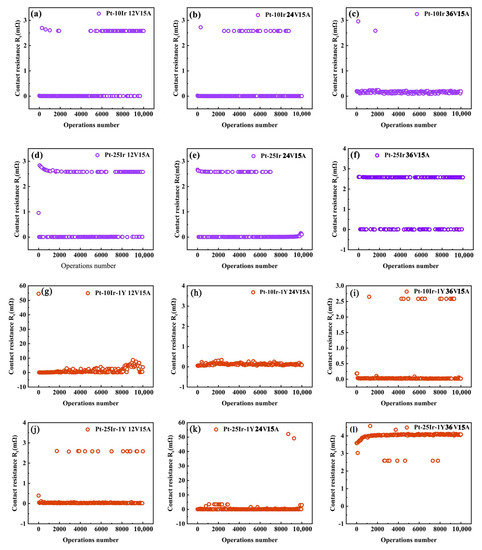 The contact resistance of Pt–Ir and Pt–Ir–Y under the same voltage and different current conditions. (a) 12 V, 15 A, Pt–10Ir, (b) 24 V, 15 A, Pt–10Ir, (c) 36 V, 15 A, Pt–10Ir, (d) 12 V, 15 A, Pt–25Ir, (e) 24 V, 15 A, Pt–25Ir, (f) 36 V, 15 A, Pt–25Ir, (g) 12 V, 15 A, Pt–10Ir–1Y, (h) 24 V, 15 A, Pt–10Ir–1Y, (i) 36 V, 15 A, Pt–10Ir–1Y, (j) 12 V, 15 A, Pt–25Ir–1Y, (k) 24 V, 15 A, Pt–25Ir–1Y, (l) 36 V, 15 A, Pt–25Ir–1Y.